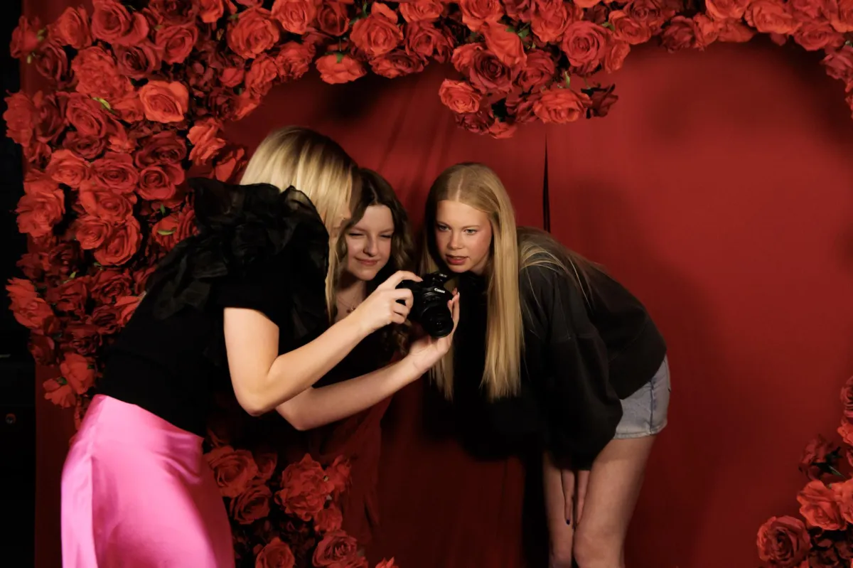 Satin-Draped Backdrop: Rich red fabric adds warmth, glow, and a high-end editorial feel.