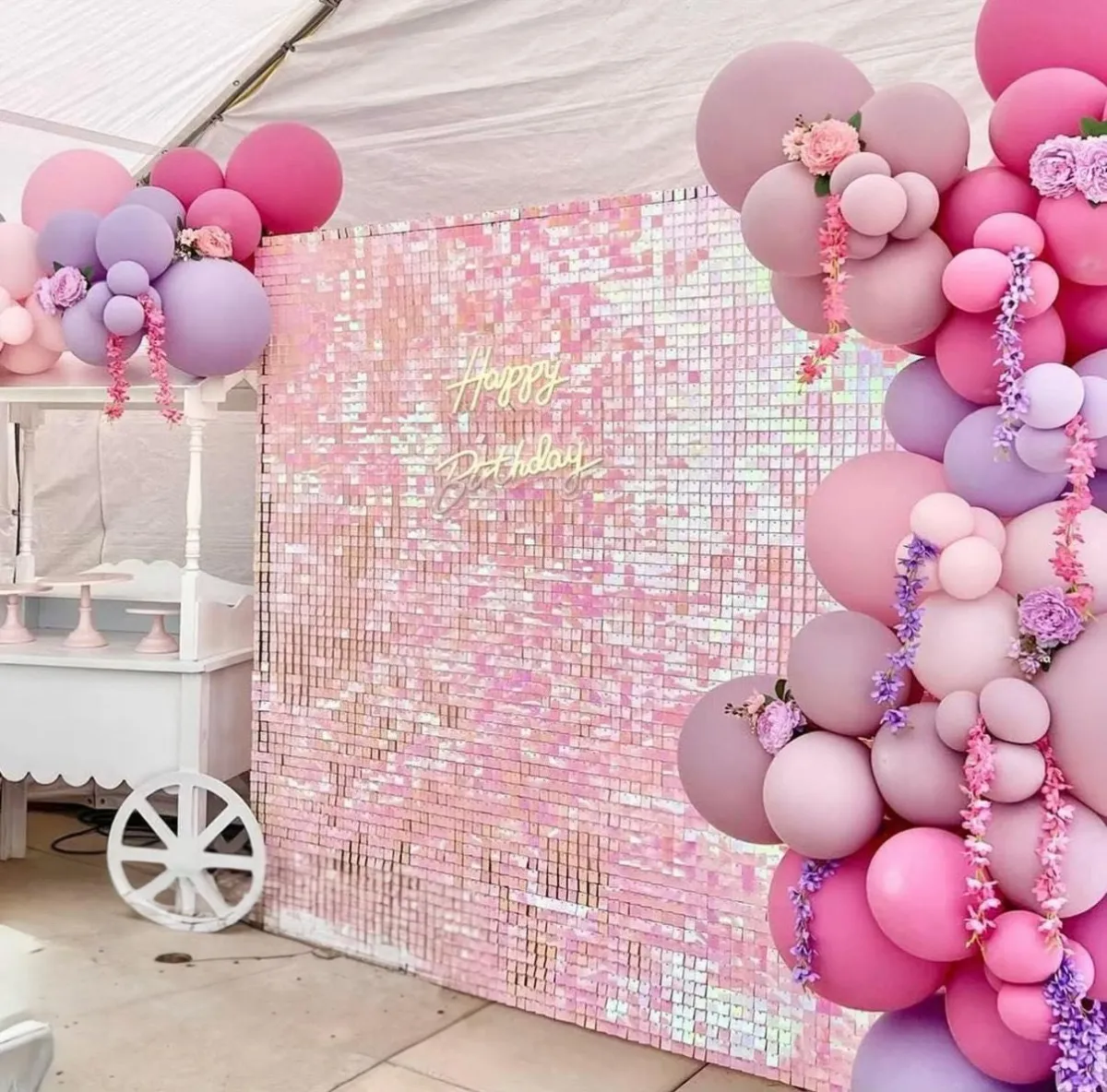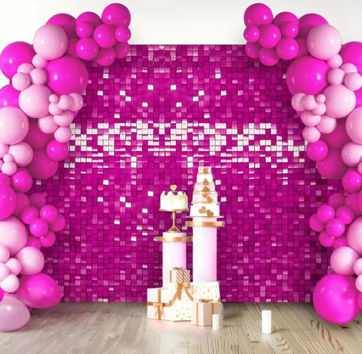 A vibrant hot pink shimmer wall designed to steal the spotlight. This backdrop is bold, fun, and made for high-energy celebrations and social-media moments.