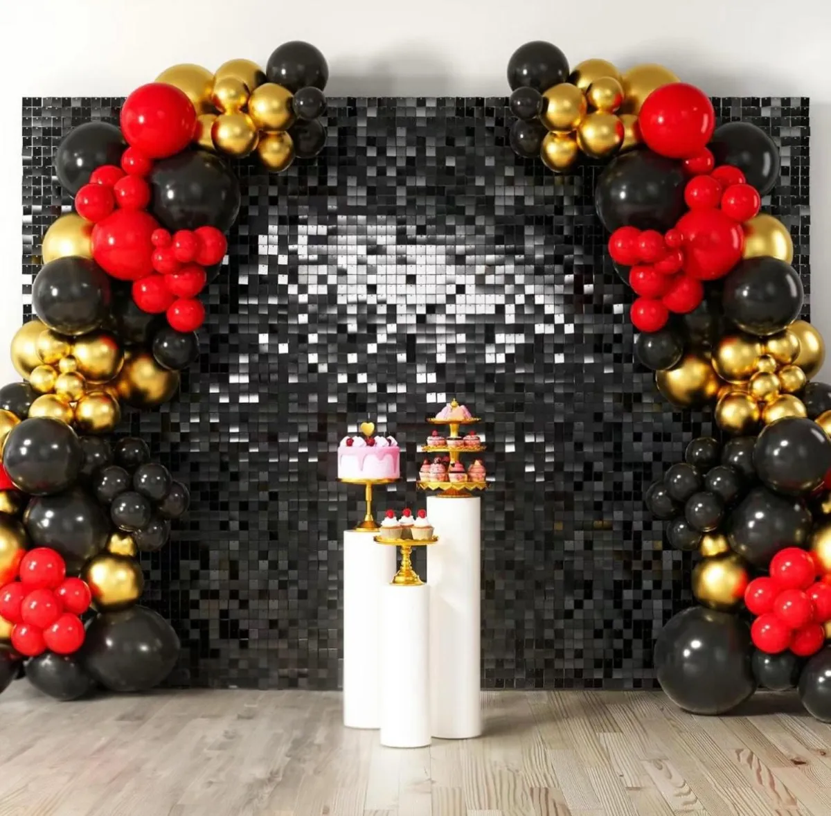 A sleek black shimmer wall designed for bold, high-contrast visuals. This backdrop adds depth and drama while keeping the setup clean and modern.